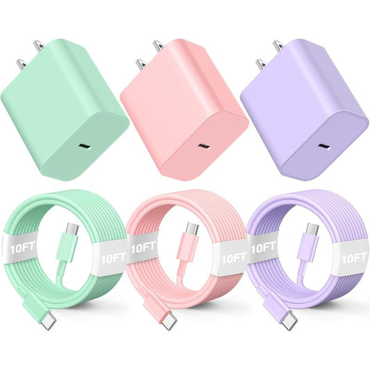 Iphone 17 16 15 Fast Charger and 10Ft Type C to C Cable Cord Long,Colour Series 20W USB C Charging Block for Iphone 16 Pro/16 Plus/15 Pro Max/15,For Ipad Wall Plug Power Adapter Cube Brick 12.9/11/Air 4Th/6 Gen/Mini