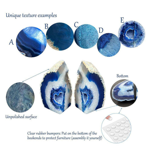 Natural Blue Agate Geode Bookends, Decorative Book Ends for Shelves, Stackable Book Stopper for Home Office Decor