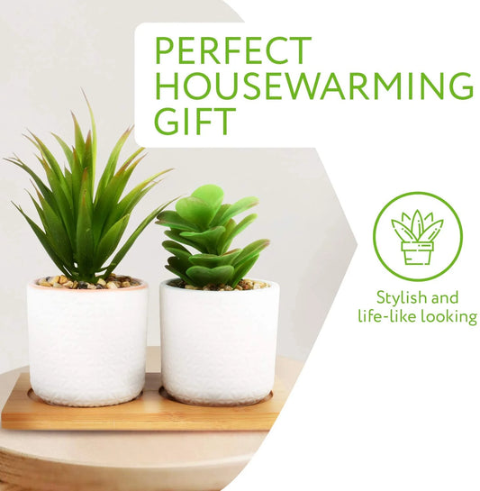 Set of 2 Artificial Succulent Plants, Fake Plants in White Ceramic Pots with Bamboo Tray, 6.5” Tall